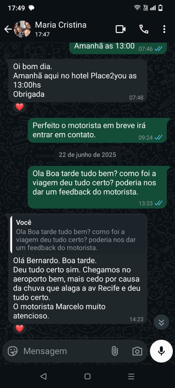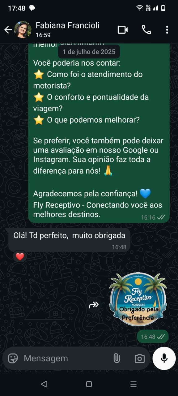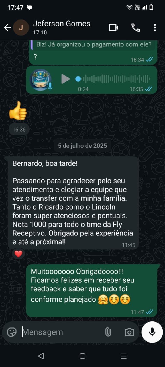 A Fly Receptivo me surpreendeu! Conheci um Recife além dos pontos turísticos. Traslados pontuais, guias atenciosos e a segurança que precisamos longe de casa. O melhor: atendimento rápido pelo WhatsApp quando precisei! Recomendo para quem quer viver o verdadeiro Nordeste.